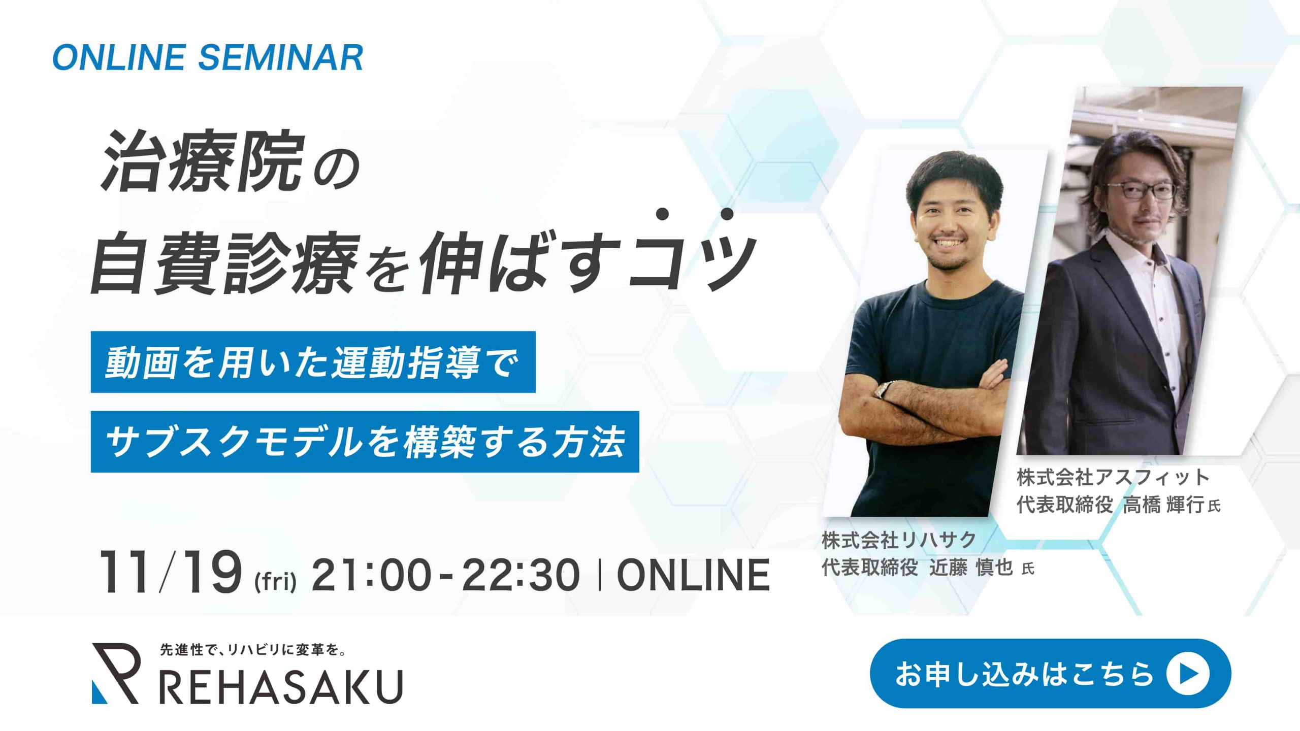 2021/11/19 「治療院の自費診療を伸ばすコツ〜動画を用いた運動指導でサブスクモデルの構築方法〜」 - 株式会社リハサク