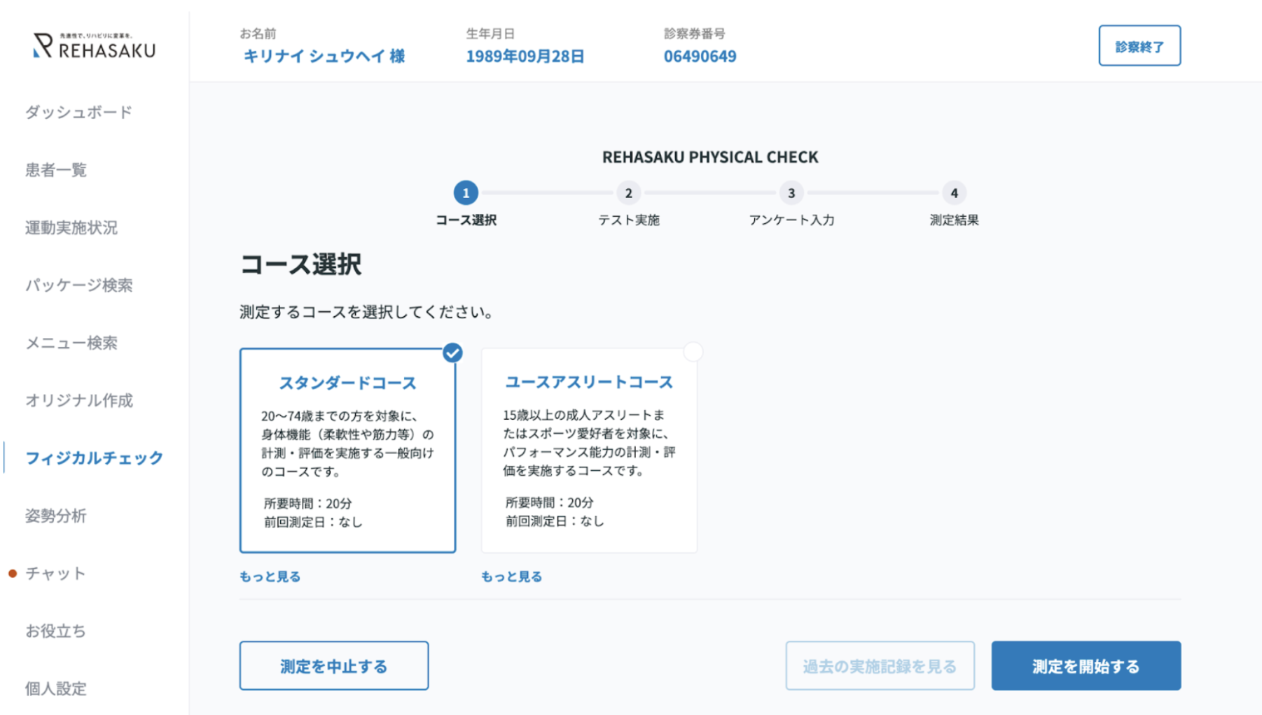 当院ではリハサクを活用し、月額制の「運動の処方箋」というプログラムを展開しています。「運動の処方箋」は、リハサクの姿勢分析とフィジカルチェックを行うことで得られる評価結果に基づき、患者さん一人ひとりに合わせた約15分の個別トレーニングを作成します。4ヶ月契約で月額プランにご加入いただき、週1回(最大月5回)院内のモニターを見ながら運動を行っていただきます。2〜3ヶ月ごとに再評価を行いながら、契約更新を通じて継続的な運動習慣をサポートしています。